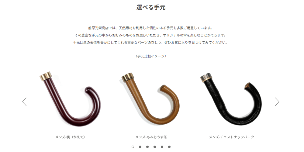 前原光榮商店の洋傘は、豊富なラインナップが魅力です。とくに、傘の顔ともいえる手元を好みに合わせて選べるシステムになっています。天然素材を使用した個性豊かな手元が多数用意されており、自分だけの特別な傘に仕立てることが可能です。