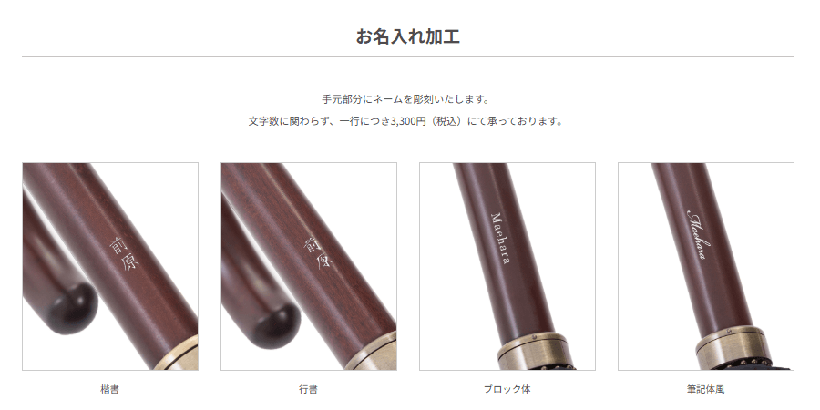 ギフトとしての特別感をさらに高めてくれるのが、名入れサービスです。手元部分に名前を刻印することで、世界にひとつだけのオリジナルな傘になります。漢字はもちろん、アルファベットでの名入れも可能なので、傘の雰囲気に合わせて選べるのも嬉しいポイントです。